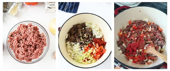 - Cook and crumble the ground beef in a large pot over medium high heat until browned and cooked through, about 8 minutes. Drain grease.